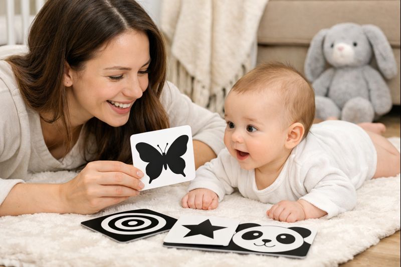 High contrast is still helpful even after babies begin to notice colors. The goal is calm focus, not overstimulation.